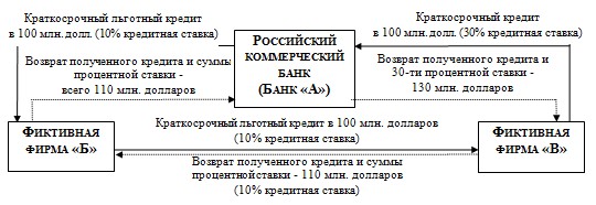 Даний спосіб розкрадання, як правило, традиційно складається з трьох етапів. Підготовчий етап. Виконавчий директор (керуючий, менеджер) комерційним банком, який не є його акціонером, за попередньою змовою, іноді з російськими, але найчастіше із зарубіжними спільниками відкривають за кордоном (зазвичай в офшорній зоні) за підробленими документами або ж на підставних осіб фіктивні фірми. Відповідно до попередніми злочинною змовою керуючий російським комерційним банком («А») надає закордонній фірмі «Б» короткостроковий пільговий кредит (припустимо в 100 млн. доларів) з 10% кредитною ставкою. У свою чергу фірма «Б» надає іншій закордонній фірмі «В» точно такий же кредит на ту ж суму і з тією ж 10% кредитною ставкою. Після цього фірма «В» надає російському комерційному банку («А») такий же кредит в 100 млн. доларів, але вже з 30% кредитною ставкою. Етап безпосереднього розкрадання. Після закінчення терміну, на який були надані всі три кредити, відбуваються наступні фінансово-банківські операції: а) фірма «Б» повертає російському комерційному банку «А» суму кредиту - 100 млн. доларів і процентну ставку - 10 млн. доларів (всього - 110 млн. доларів); б) фірма «В» також розраховується з фірмою «Б», перерахувавши на її рахунок у банку офшорної зони - 110 млн. доларів (100 млн. доларів сума кредиту + 10 млн доларів - кредитна процентна ставка); в) у свою чергу російський комерційний банк «А» виплачує фірмі «В» - 130 млн. доларів. Таким чином, у розпорядженні шахраїв залишається 20 млн. доларів злочинного доходу, оскільки 10 млн. доларів їм довелося перерахувати російському комерційному банку «А» за надання пільгового кредиту фірмі «Б». 20 млн. доларів - кримінальний доходів, через кілька банківських «інстанцій» були переведені на особисті рахунки шахраїв в зарубіжних банках (в основному, знаходяться в офшорних зонах) і привласнені злочинцями. Етап приховування злочину а) керуючий російським комерційним банком готує докладне обгрунтування збиткової кредитної угоди для звіту перед радою директорів, засновниками, або нарадою акціонерів, посилаючись при цьому на форс -мажорні обставини, інші «поважні» причини, представляючи при цьому заздалегідь підготовлені документи. Потім у своєму звіті менеджер посилається на загальний активний баланс своєї діяльності, який звичайно з лишком покриває збитки від однієї «невдалою» угоди (20 млн. доларів). Б) фіктивні фірми «Б» і «В» швидко ліквідуються, а спільники російського менеджера, з'являються вже під іншими анкетними даними. Структуру розглянутого способу шахрайства можна відобразити в наступною схемою. Схема Схема шахрайських дії з розкрадання грошових коштів способом створення різниці в процентних ставках при виділенні короткострокових кредитів Слід зазначити, що в злочинної діяльності шахраїв структура способу вчинення злочину складніша, ніж описана в тексті і відображена у простий (елементарної) схемою. Але проте схема дає досить чітке відображення досліджуваного способу шахрайських дій. 4. Типові (узагальнені) дані про особу шахрая, які вчиняють злочини у сфері економіки. Вивченням особистості злочинця, що здійснює шахрайства в сфері економіки, інтенсивно займаються, кожна зі своїх позицій, кримінологія та криміналістика. Однак цілий ряд особистісних рис злочинця, що мають важливе інформаційно-пошукове значе