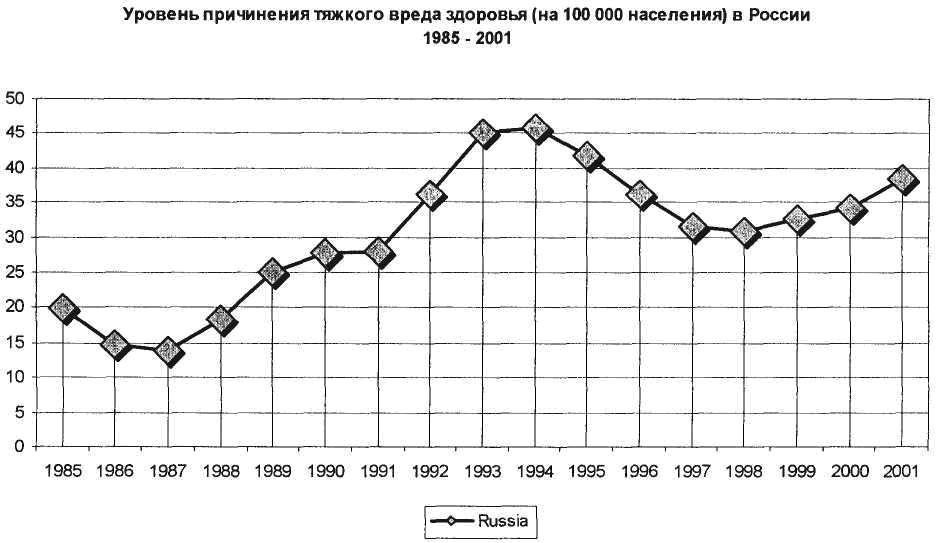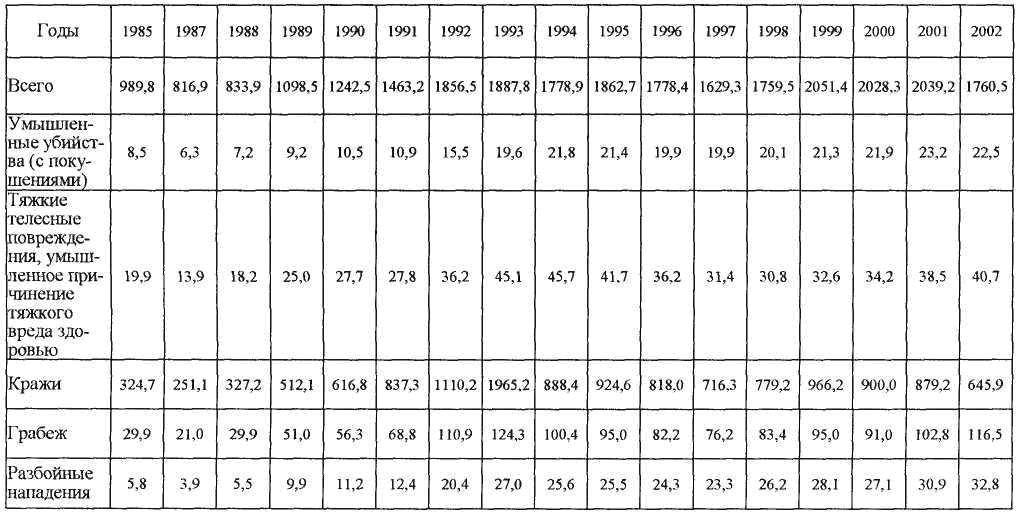 Починаючи огляд стану злочинності та основних тенденцій її змін, необхідно ще раз нагадати, що ми можемо судити тільки про зареєстровану її частини, а тому будь-які наші судження будуть носити відносний, орієнтовний характер. З іншого боку, не можна зовсім знехтувати наявними даними кримінальної статистики і, по можливості, результатами досліджень, бо вони складають необхідну емпіричну базу для теоретичних міркувань. Криминологический аналіз світових та вітчизняних тенденцій злочинності досить повно відображений у роботах В. В. Лунеева - в серії статей та монографії *. Тому ми можемо обмежитися лише найзагальнішими відомостями і коментарями. * Лунеев В. В. Злочинність XX століття: Світовий кримінологічний аналіз. М., 1997. Як зазначає у своїй монографії В. В. Місяці, основною світовою тенденцією з середини XX століття є абсолютний і відносний (у розрахунку на 100 тис. жителів) зростання реєструється злочинності. Цей висновок грунтується, насамперед, на аналізі чотирьох оглядів ООН, узагальнених у вигляді таблиці, яку ми і відтворюємо (табл. 7.1). Таблиця 7.1 Усереднені та оціночні дані про злочинність у світі Отже, спостерігається стійке зростання зареєстрованої злочинності при значно вищому рівні злочинності в розвинених країнах у порівнянні з розвиваються. Але що це - реальне зростання кримінальності або ж результат підвищення активності поліції і нетерпимості населення до злочинності? ... Крім того, у багатьох європейських країнах з середини 90-х рр.. минулого століття намітилося скорочення показників злочинності. Так, якщо з 1989 по 1999 р. злочинність по країнам - членам Європейського союзу виросла на 6%, то за 1995-1999 рр.. вона знизилася на 1%, а за 1991-2001 рр.. - На 0,1% *. «Переломними» з'явилися для Австрії 1994/95 рр.., Англії 1992/93 рр.., Німеччині - 1993/94 рр.., Данії - 1997/98 рр.., Канади - 1992/93 рр.., Нідерландів - 1993/94 рр.. , США - 1991/92 рр.., Франції - 1994/95 рр.. ** Правда, в деяких країнах зростання злочинності тривав до початку XXI в. (В Австралії, Бельгії, Норвегії). * Barclay G., Tavares С., Siddique A. International comparisons of criminal statistics 1999 / / Home Office Statistical Bulletin, 2001. Issue 6/01. P. 7; Barclay G., Tavares З et all. International Comparisons of Criminal Justice Statistics 2001 / / Home Office Statistical Bulletin, 2003. Issue 12/03. P. 3 ** Деяке зростання реєструвався в 2001-2002 рр.. (Du Clos I. Recent Trends of Crime in Paris Roma, ISTAT, 2003). Інша тенденція, відзначена В. В. Лунєєва - «гуманізація» злочинності: скорочення частки насильницьких злочинів в загальному її обсязі. Розглянемо як приклад динаміку злочинності в ряді країн, грунтуючись на даних офіційної статистики. У ФРН рівень загальної злочинності (на 100 тис. чоловік населення) становив: 1955 р. - 3018, 1960 р. - 3660, 1965 р. - 3031, 1970 р. - 3924, 1975 г . - 4721, 1980 р. - 6198, 1985 р. - 6909, 1990 р. - 7108. 1992 р. - 7921, 1993 р. - 8337, 1994 р. - 8038, 1995 р. - 8179 ^ 1996 р. - 8125, 1997 р. - 8031, 1998 р. - 7869, 1999 р. - 7682, 2000 г . - 7625, 2001 р. - 7736 *. Таким чином, з 1955 р. по 1993 р. рівень злочинності зріс майже в 2,8 рази. З 1993 р. рівень злочинності стабілізувався з тенденцією до зниження. Рівень убивств і «смертельних ушкоджень» (Totsch-lag) у ФРН також зростав (хоча цей рівень нікчемний, порівняно з Росією): 1953 -1,6, 1963 р. - 2,3, 1973 р. - 4, 3, 1983 р. - 4,4, 1985 р. - 4,6. З 1986 р. цей показник дещо знизився (1988 р. - 4,1, 1990 р. - 3,8), але з 1991 р. знову збільшується до 5,2 в 1993 р. з подальшим постійним зниженням до 3,2 до 2001 **. Рівень убивств (без «смертельних ушкоджень») в середньому за 1999-2001 рр.. у ФРН склав 1,1 ***. Взагалі у ФРН фіксується «сплеск» злочинів в 1993 р., а потім спостерігається їх скоро